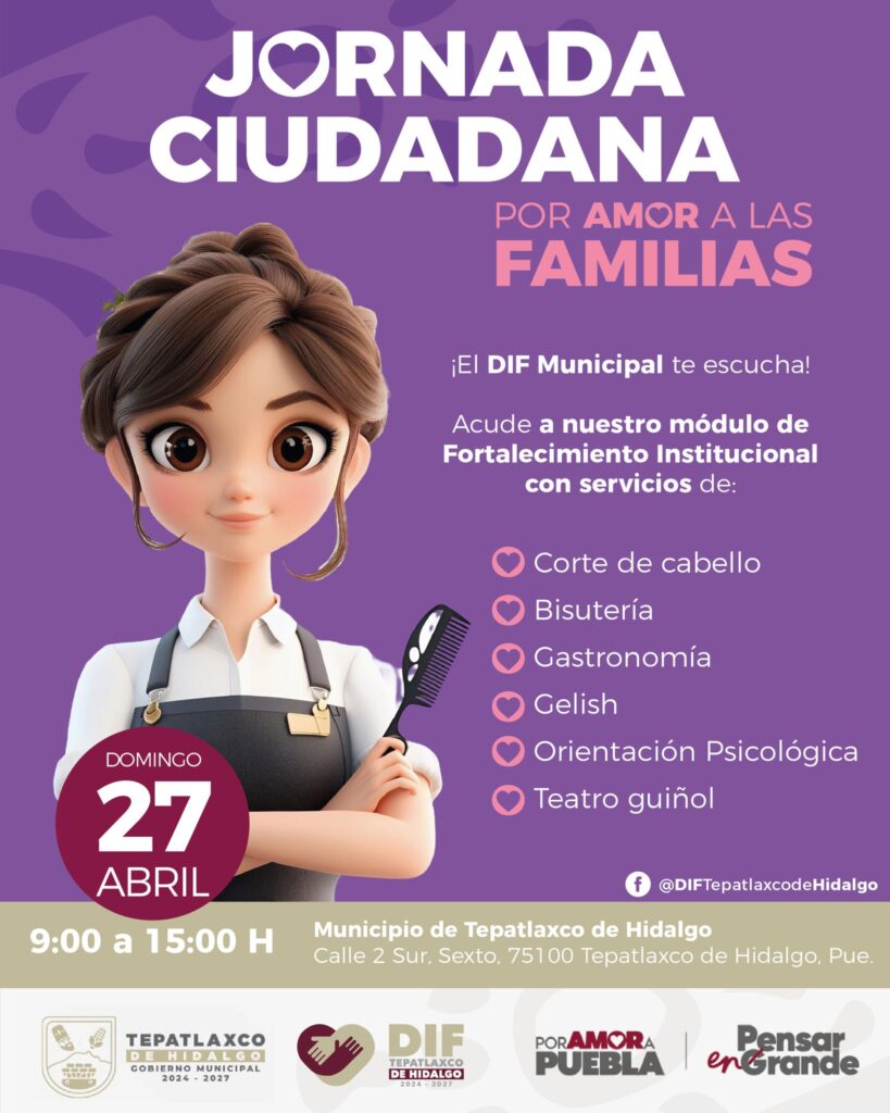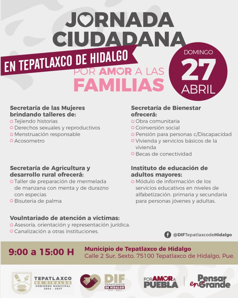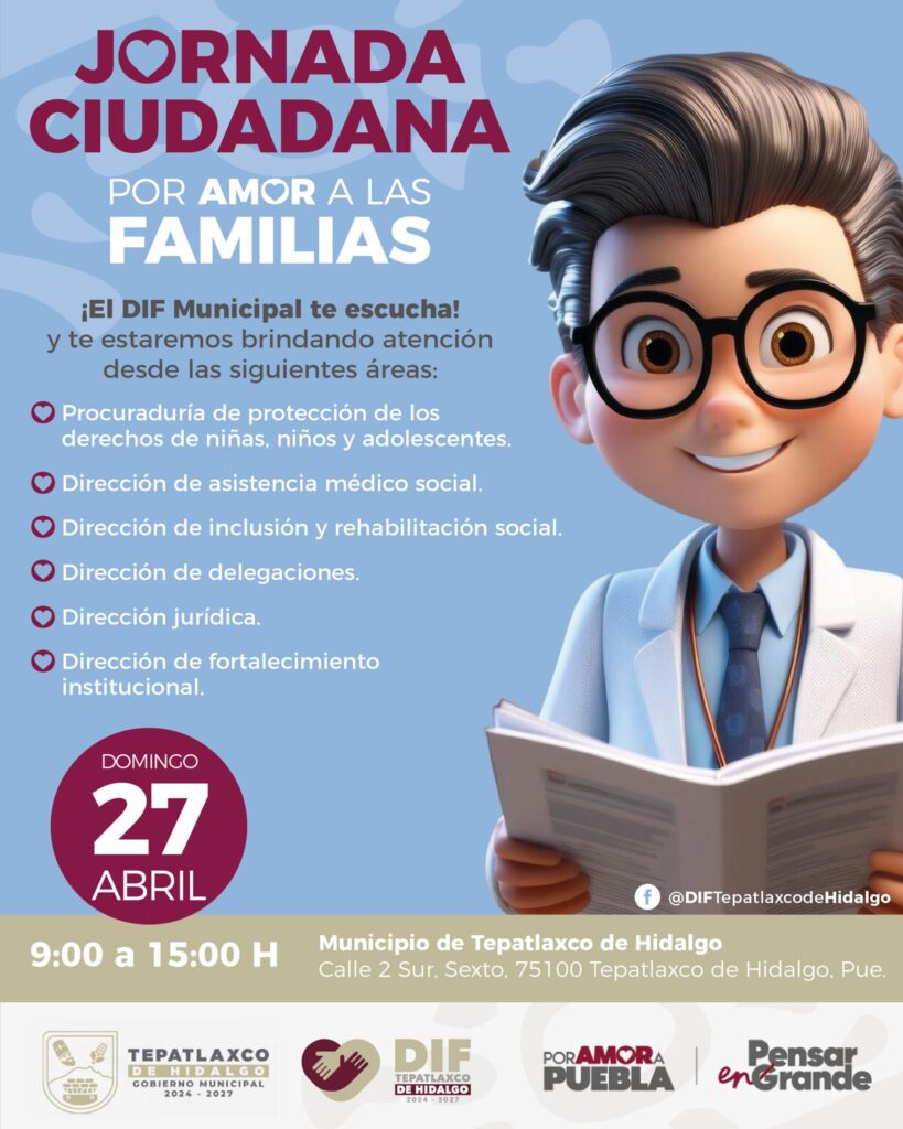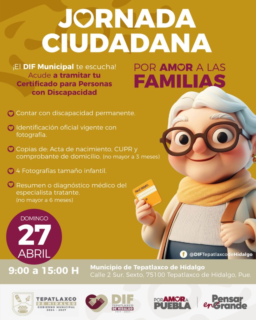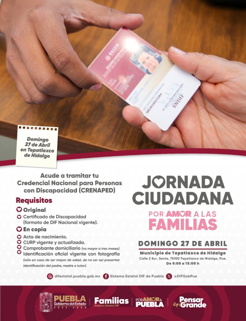 El Sistema Estatal DIF de Puebla invita a la población a participar en la Jornada Ciudadana “Por Amor a las Familias”, que se llevará a cabo el próximo domingo 27 de abril en el municipio de Tepatlaxco de Hidalgo. Esta jornada tiene como objetivo facilitar el registro en la CRENAPED (Credencial Nacional para Personas con Discapacidad) para niñas, niños y adolescentes con discapacidad.