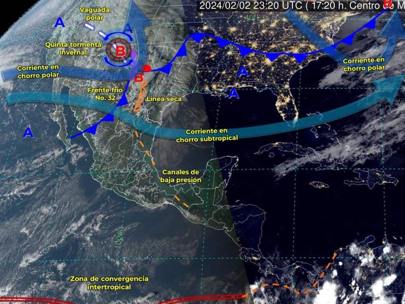 Según dio a conocer el Servicio Meteorológico Nacional (SMN) de México, el pronóstico del clima para hoy domingo 4 de febrero de2024, señala la presencia del frente frío No. 32 sobre territorio nacional, pues continuará su desplazamiento sobre el noroeste del país, provocando corrientes de chorro polar y subtropical en la mayoría de los estados.