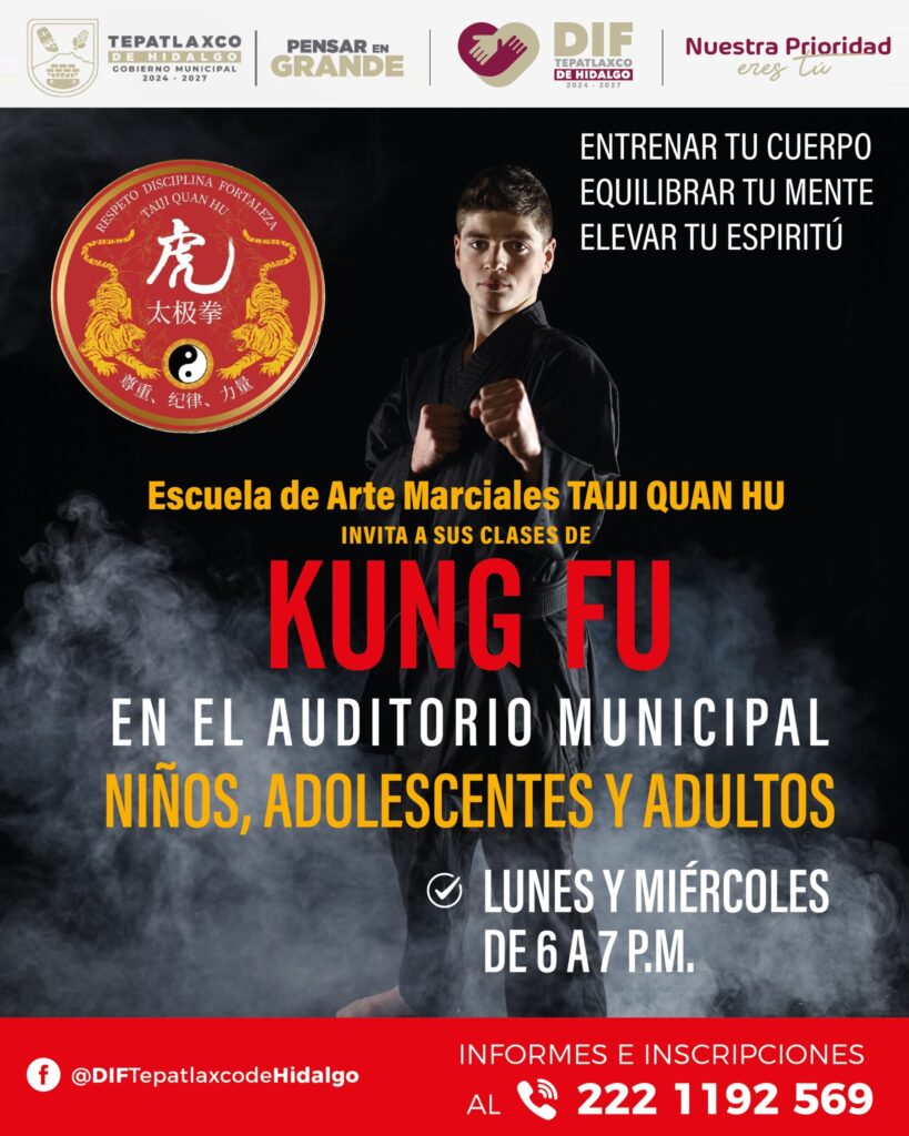 Tepatlaxco de Hidalgo, Puebla. — El DIF Municipal de Tepatlaxco, en colaboración con la Escuela de Artes Marciales Taiji Quan Hu, invita a la comunidad a formar parte de las nuevas clases de Kung Fu que se estarán impartiendo en el Auditorio Municipal.