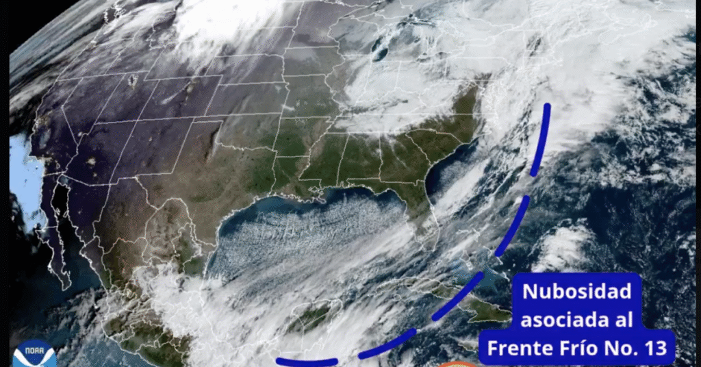 El Servicio Meteorológico Nacional informó que El frente frío número 13 continúa su recorrido por el territorio nacional y está dejando lluvias torrenciales, fuertes rachas de viento y un marcado descenso de temperatura en varios estados del país durante la madrugada de hoy , el sistema frontal se comenzó a desplazarse sobre el sureste mexicano y la península de Yucatán, mientras que la masa de aire ártico que lo impulsa comenzó a cubrir la mayor parte del territorio nacional.