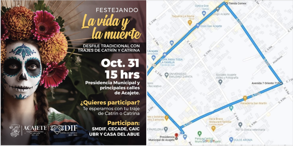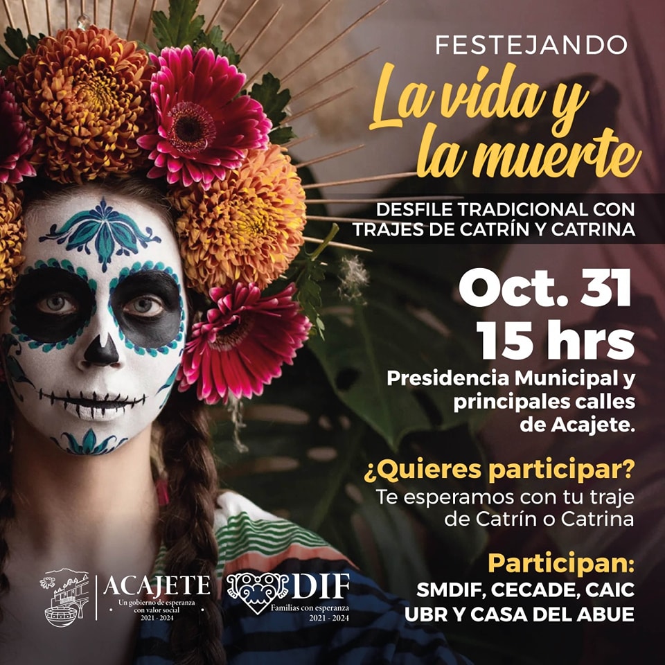 Acajete, Pue.- El Gobierno Municipal de Acajete a través del Sistema Municipal DIF, te invita este lunes 31 de octubre del 2022 a participar y presenciar el desfile tradicional con trajes de catrín y catrina, con motivo al día de muertos.