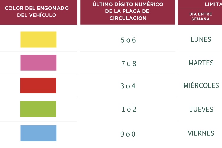 - Viernes: no podrán circular los vehículos con color engomado azul y placas con terminación 9 o 0.