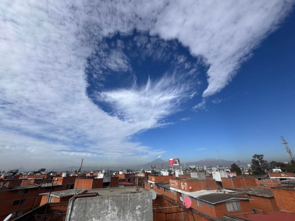 Llama la atención de personas en la calle el cielo esta mañana en la ciudad de Puebla, con nubes aborregadas y un espacio circular sin nubes al centro. #Clima pic.twitter.com/WqlAXpklfO