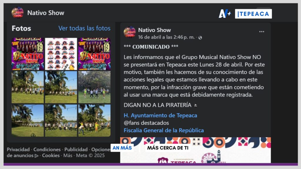 “Les informamos que el Grupo Musical Nativo Show no se presentará en Tepeaca este lunes 28 de abril. Por este motivo también les hacemos de su conocimiento de las acciones legales que estamos llevando a cabo en este momento por la infracción grave que están cometiendo al usar una marca debidamente registrada. Digan no a la piratería”, escribieron en redes.