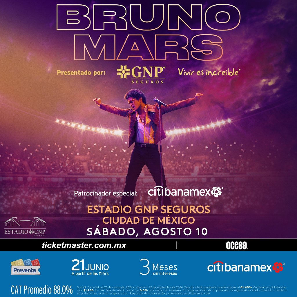 El imparable creador de éxitos y artista ganador de 14 premios GRAMMY, Bruno Mars, anuncia su regreso a México el 10 de agosto, donde se presentará en el recién renovado Estadio GNP Seguros. El anuncio sigue a la noticia de su monumental carrera de 14 shows en Brasil que se llevará a cabo en octubre. Este evento tan esperado llega después de sus icónicas actuaciones en The Town Festival en São Paulo, Brasil, el año pasado, donde tocó para más de 100,000 fanáticos cada día.