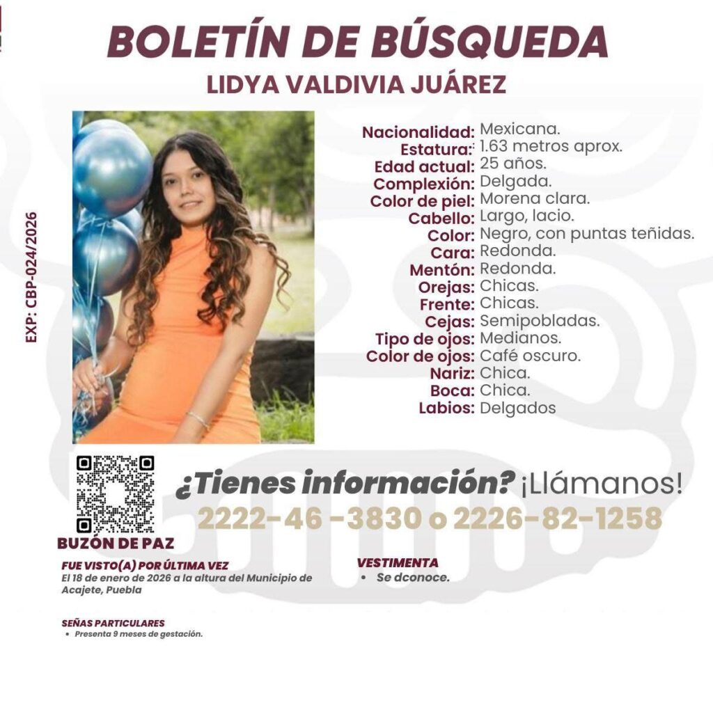 De acuerdo con información oficial, el Gobierno del Estado de Puebla, a través de la Comisión de Búsqueda de Personas, atiende el caso conforme a los protocolos establecidos y, en coordinación con el Ayuntamiento de Acajete, activó una Célula de Búsqueda para recabar indicios que permitan dar con el paradero de la joven.