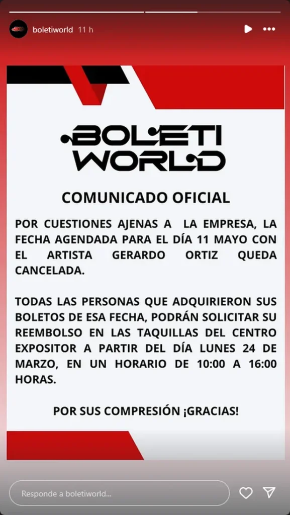 La empresa Boletiworld informó sobre la cancelación del concierto de Gerardo Ortiz, programado para el 11 de mayo, por causas ajenas a la organización. Los reembolsos podrán solicitarse a partir del lunes 24 de marzo en las taquillas del Centro Expositor, en horario de 10:00 a 16:00 horas.