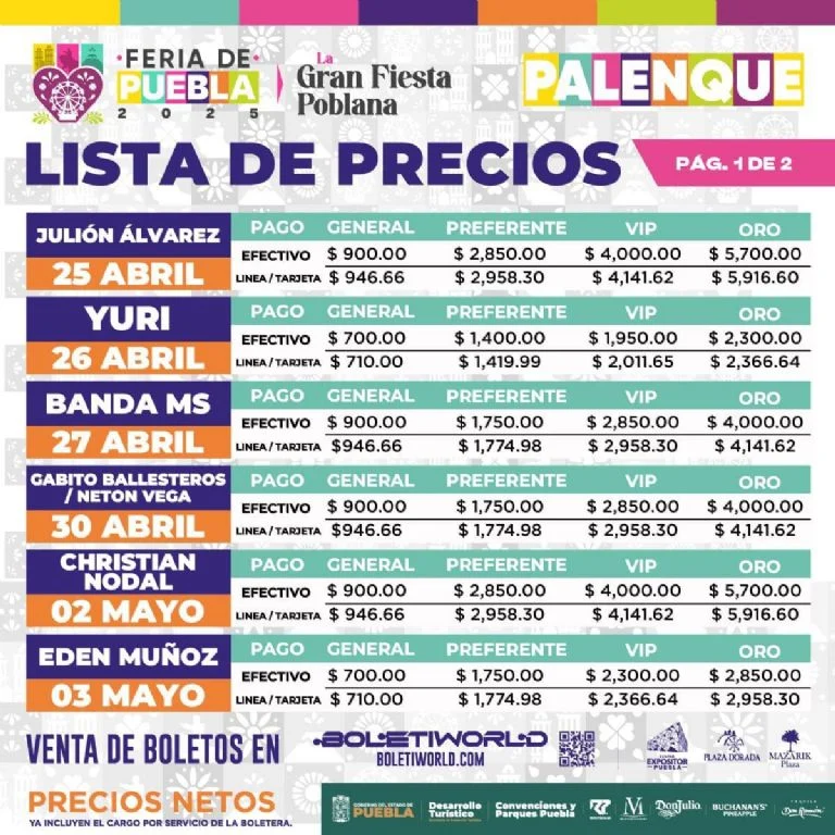 Este 19 de marzo se presentará el cartel oficial del Palenque, donde artistas de renombre ofrecerán conciertos desde las 23:59 horas en los días programados. Los boletos están disponibles desde el mediodía del 19 de marzo a través de la plataforma Boletiworld y en puntos de venta físicos: