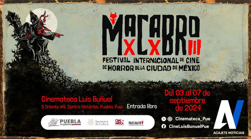 El gobierno presente de Sergio Salomón, a través de la Secretaría de Cultura, proyectará en la Cinemateca “Luis Buñuel” parte de la selección del Festival Internacional de Cine de Horror de la Ciudad de México “Macabro” 2024, la cual incluye cuatro largometrajes y dos ciclos de cortometrajes que tendrán entrada libre para las y los asistentes.