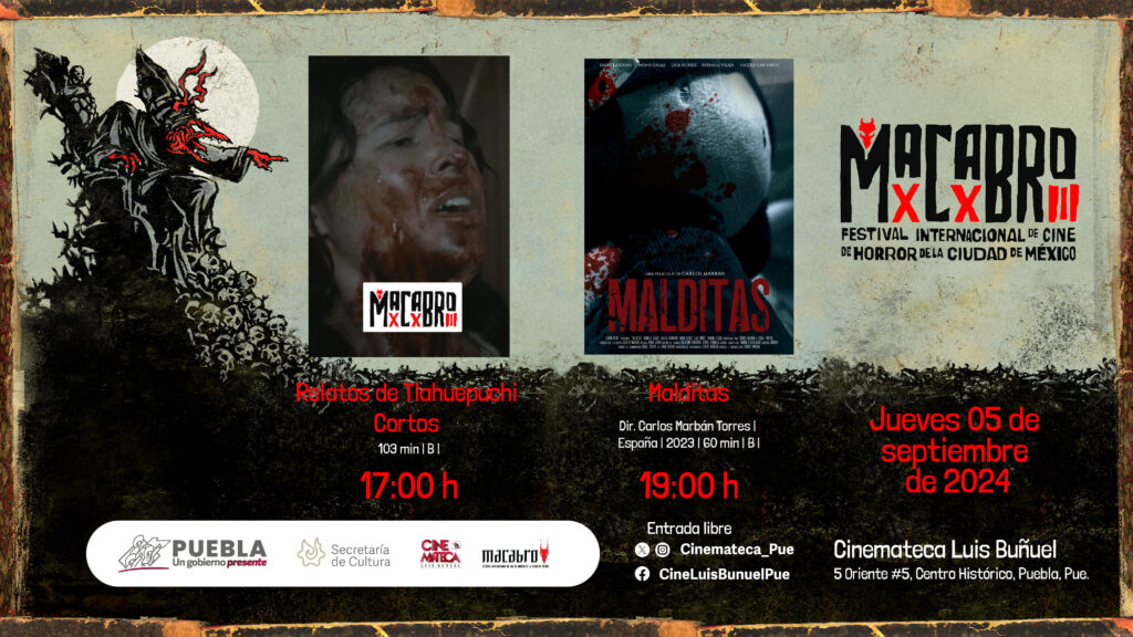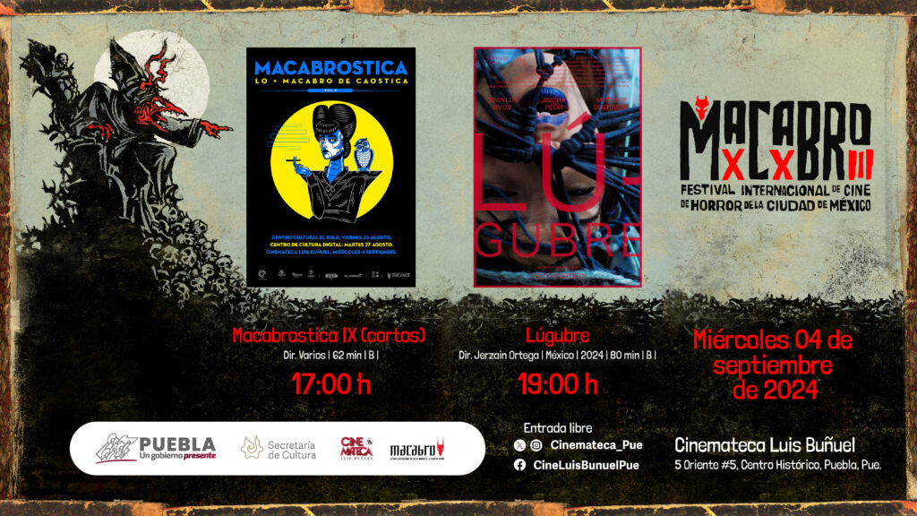 La sinopsis de los filmes, así como los títulos incluidos en los ciclos de cortometrajes pueden consultarse en la página oficial del Festival “Macabro” (macabro.mx/2024). Para conocer la programación de la Cinemateca “Luis Buñuel”, las y los interesados pueden descargar la cartelera mensual en el sitio sc.puebla.gob.mx