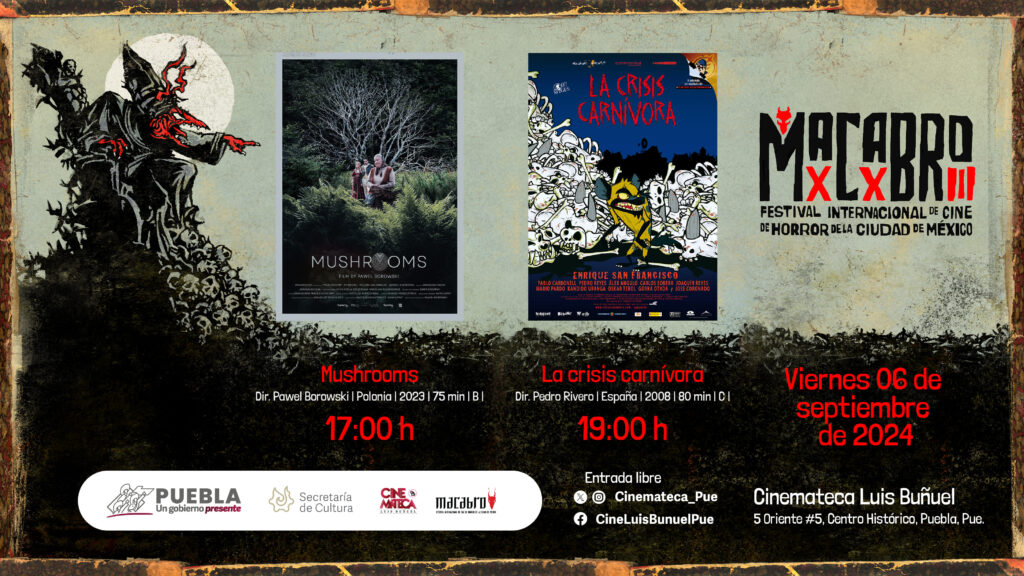 Durante el jueves 05, será expuesto el programa de cortometrajes mexicanos “Relatos de Tlahuelpuchi”, a las 17:00 horas, y el largometraje español “Malditas”, dirigido por Carlos Marbán Torres, a las 19:00 horas; mientras que el viernes 06 tendrán lugar las películas “Mushrooms”, del director polaco Pawel Borowski (17:00 horas), y “La crisis carnívora”, del español Pedro Rivero (19:00 horas).