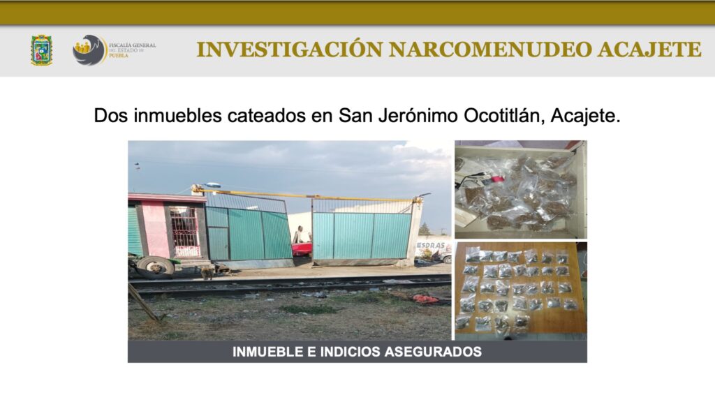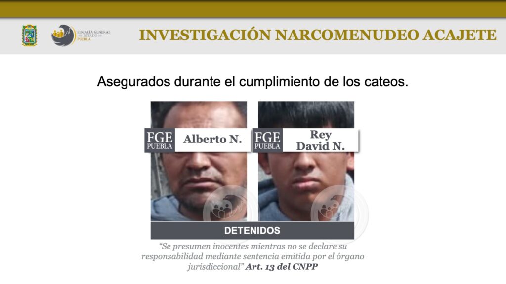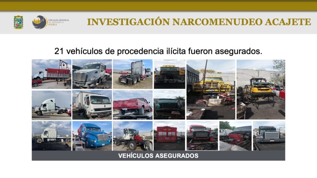 En ese sentido, se informó que en dos cateos en San Jerónimo Ocotitlán, Acajete, fueron detenidos Alberto N. y Rey David N. y se aseguraron 21 vehículos, 4 motores con series alteradas, así como 197 dosis de cristal y marihuana, 20 cartuchos, equipos GPS, entre otros indicios.
