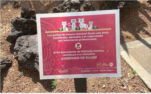“Los gatitos de Palacio Nacional llevan una dieta equilibrada, saludable y es supervisada por veterinarios profesionales. Evita alimentarlos de diferentes maneras, contribuye a su bienestar. ¡Cuidemos de ellos!”, se lee en uno de los letreros que hay en Palacio Nacional.