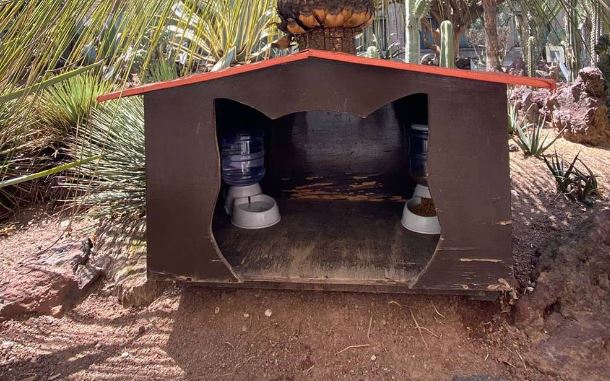 Las casitas de estos animales están diseñadas con contorno de la figura de gato en donde se les colocan todos los días alimento especial, así como agua.