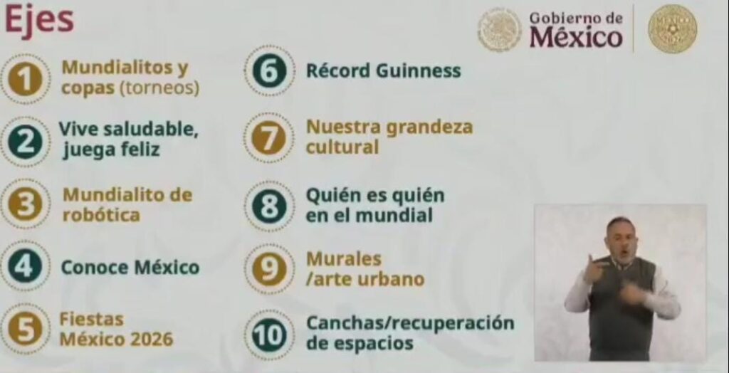 Mientras tanto, en México, el Gobierno Federal avanza en los preparativos rumbo a la Copa Mundial de la FIFA 2026. Como parte del denominado Mundial Social 2026, la presidenta de México, Claudia Sheinbaum Pardo, encabezó la presentación de los 74 Mundialitos y Copas de Futbol que se desarrollarán en todo el país como parte de las actividades previas al evento internacional.