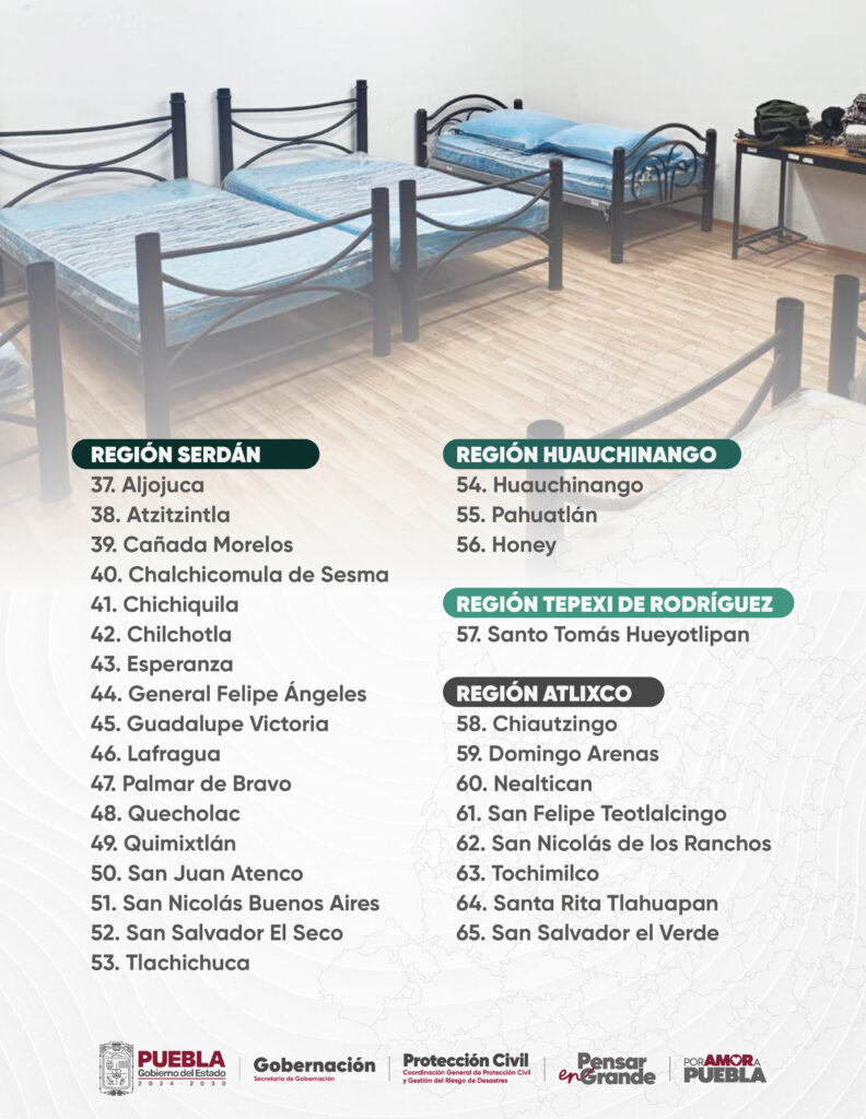 Detalló que el programa Dormitorio Seguro se implementa principalmente en municipios de la Sierra Norte, Sierra Nororiental, Valle de Atlixco y la región de Serdán, zonas que históricamente presentan las mayores afectaciones por bajas temperaturas.