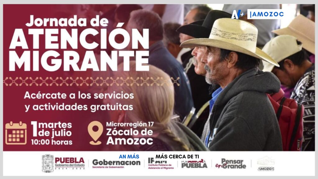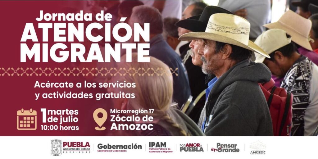 El Gobierno del Estado de Puebla, a través del Instituto Poblano de Asistencia al Migrante (IPAM), en coordinación con el H. Ayuntamiento de Amozoc 2024-2027, invita a toda la comunidad a participar en la Jornada de Atención al Migrante, que se realizará como parte del programa “Martes de Atención Migrante”.