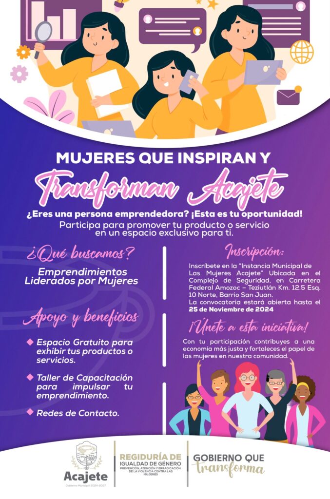 El Gobierno Municipal, a través de la Regiduría de Igualdad de Género, Prevención, Atención y Erradicación de la Violencia Contra las Mujeres “INVITAN” a las mujeres del municipio a ser parte de la convocatoria “Mujeres que Inspiran y Transforman Acajete”, un espacio para reconocer a aquellas mujeres extraordinarias que, con su trabajo, esfuerzo y dedicación, están generando cambios positivos en nuestra comunidad.