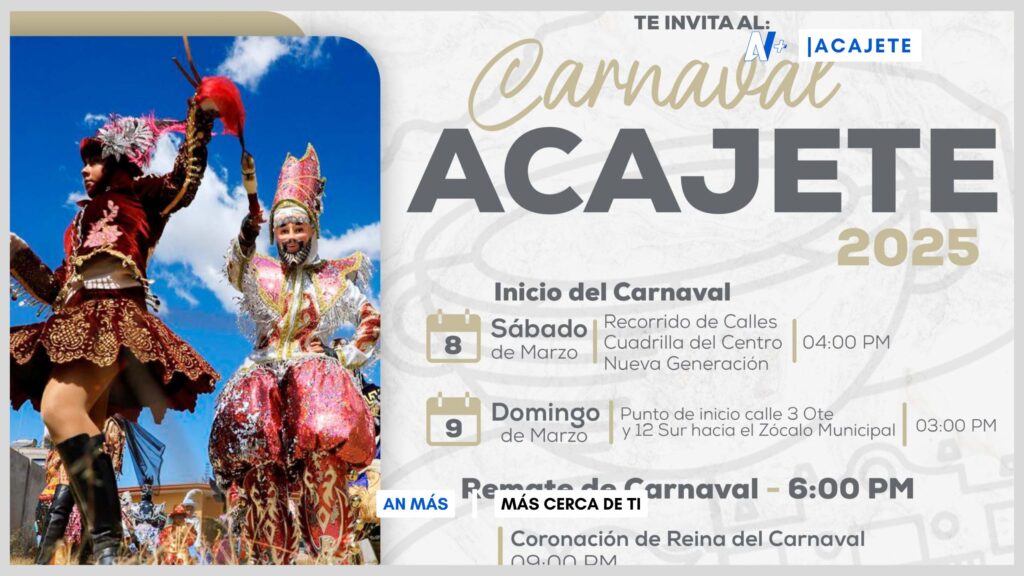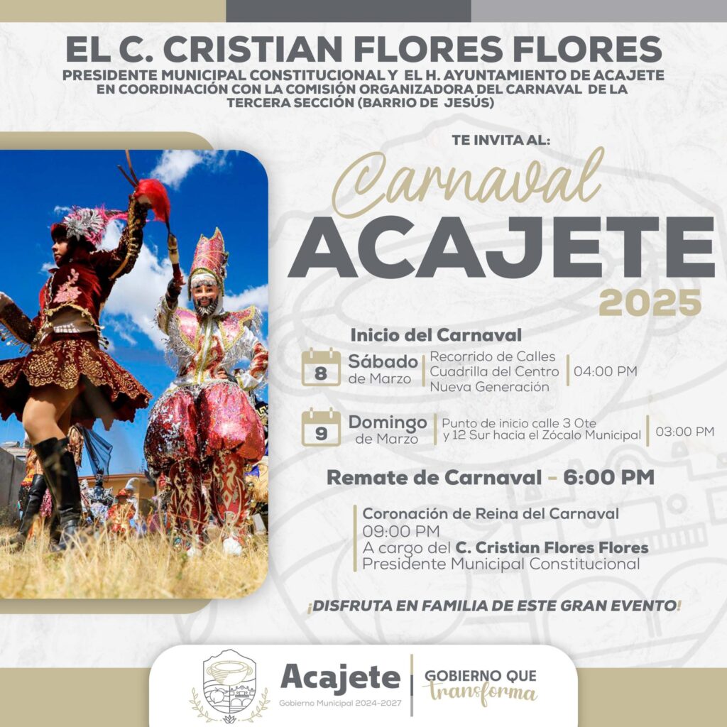 Acajete, Puebla. – El H. Ayuntamiento Municipal 2024-2027, en coordinación con la Comisión Organizadora de la Sección Tercera “Barrio de Jesús”, han anunciado la realización del tradicional Carnaval de Acajete 2025, una celebración que promete estar llena de música, danzas y coloridos desfiles.