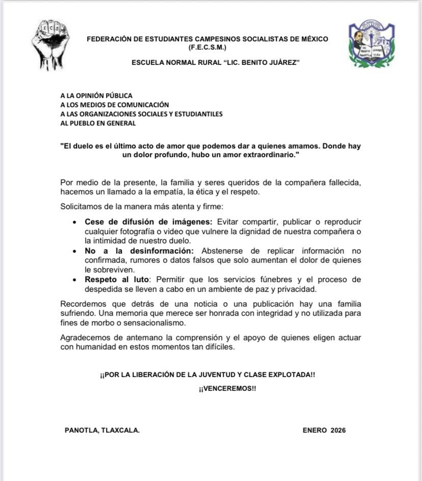 Asimismo, se informó que el cuerpo fue encontrado a un costado de los campos deportivos de la Normal Rural Benito Juárez, en una zona donde hay árboles. De manera extraoficial, trascendió que la joven habría dejado un mensaje en el que explicaría el motivo de su decisión; sin embargo, esta información no ha sido confirmada por las autoridades.