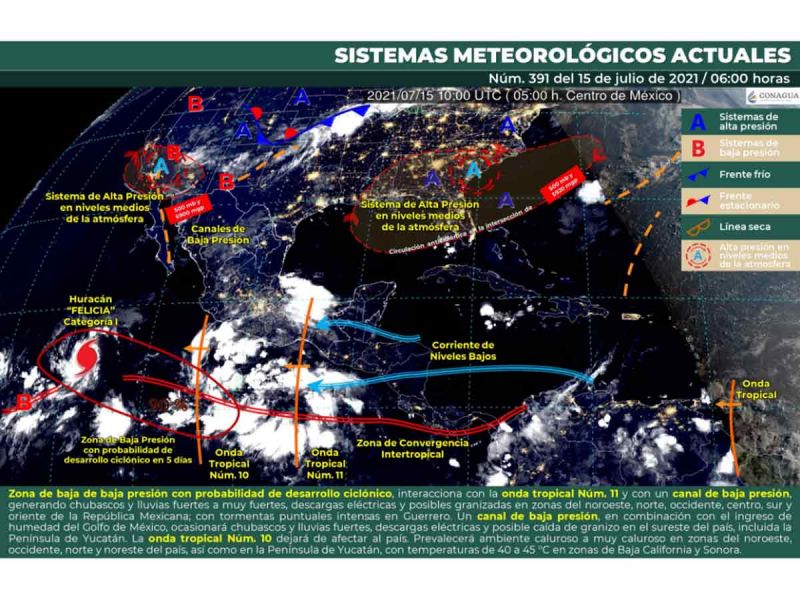 La Comisión Nacional del Agua (Conagua), de la que depende el Sistema Meteorológico, pronosticó en mayo pasado la formación de entre 14 y 20 sistemas con nombre en el océano Pacífico para esta temporada, mientras que para el Atlántico previó de 15 a 19 fenómenos.
