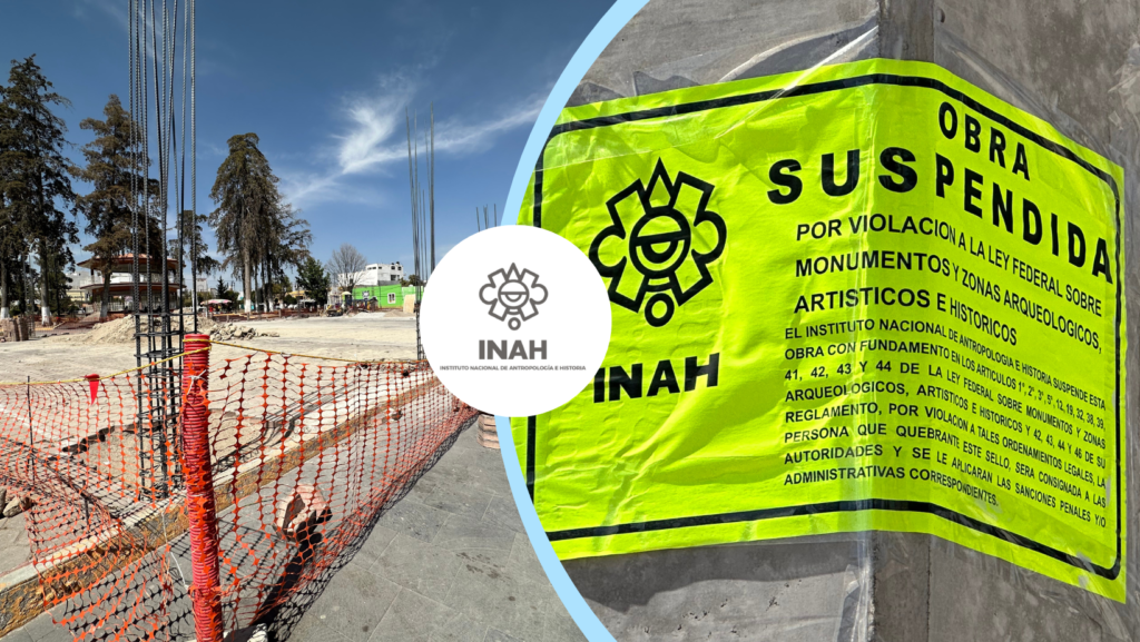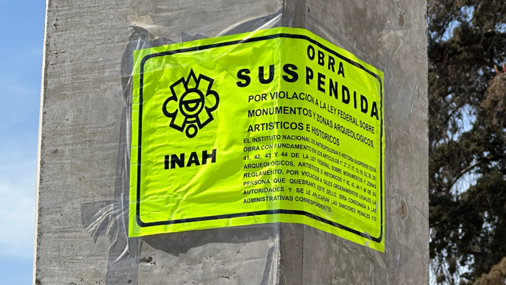 En los sellos colocados por el INA especifica “Obra Suspendida” Por violación a la ley federal sobre monumentos y zonas arqueológicas, Artísticos e históricos el Instituto Nacional de Antropología e Historia suspende esta obra con fundamentos en los articulos 1º,2º,3º,5º, 12, 19, 32, 38, 39, 41, 42, 43 y 44 de la ley federal sobre monumentos y Zonas Arqueológicas, Artísticos e Historicos y 42, 43, 44 y 46 de su reglamento, por violación a tales ordenamientos legales, la persona que quebrante este sello, será consignada a las autoridades y se le aplicara las sanciones penales y/o administrativas correspondientes.