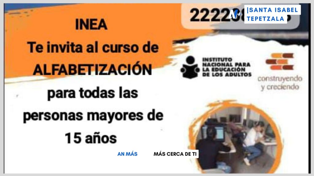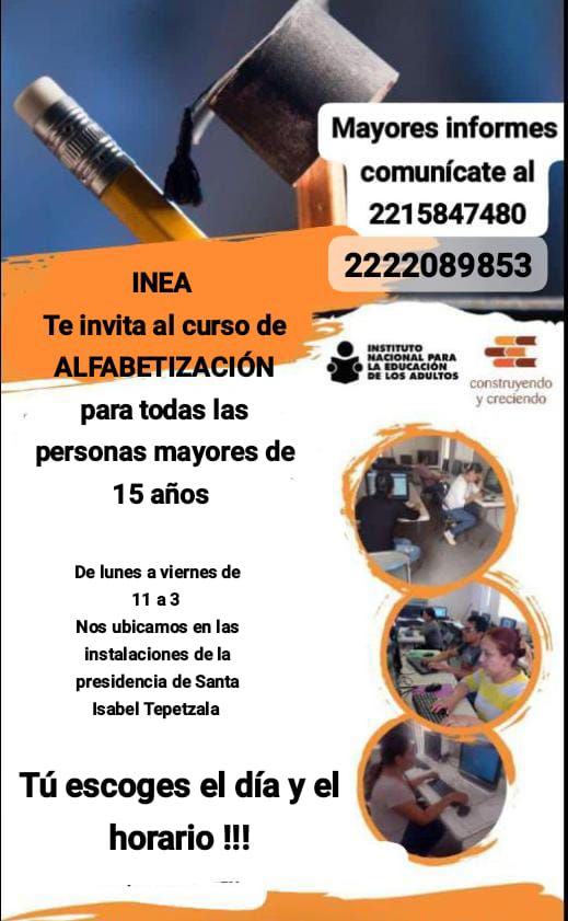 El Instituto Nacional para la Educación de los Adultos (INEA) invita a todas las personas mayores de 15 años a participar en el curso gratuito de alfabetización que se impartirá de lunes a viernes, en un horario de 11:00 de la mañana a 3:00 de la tarde.