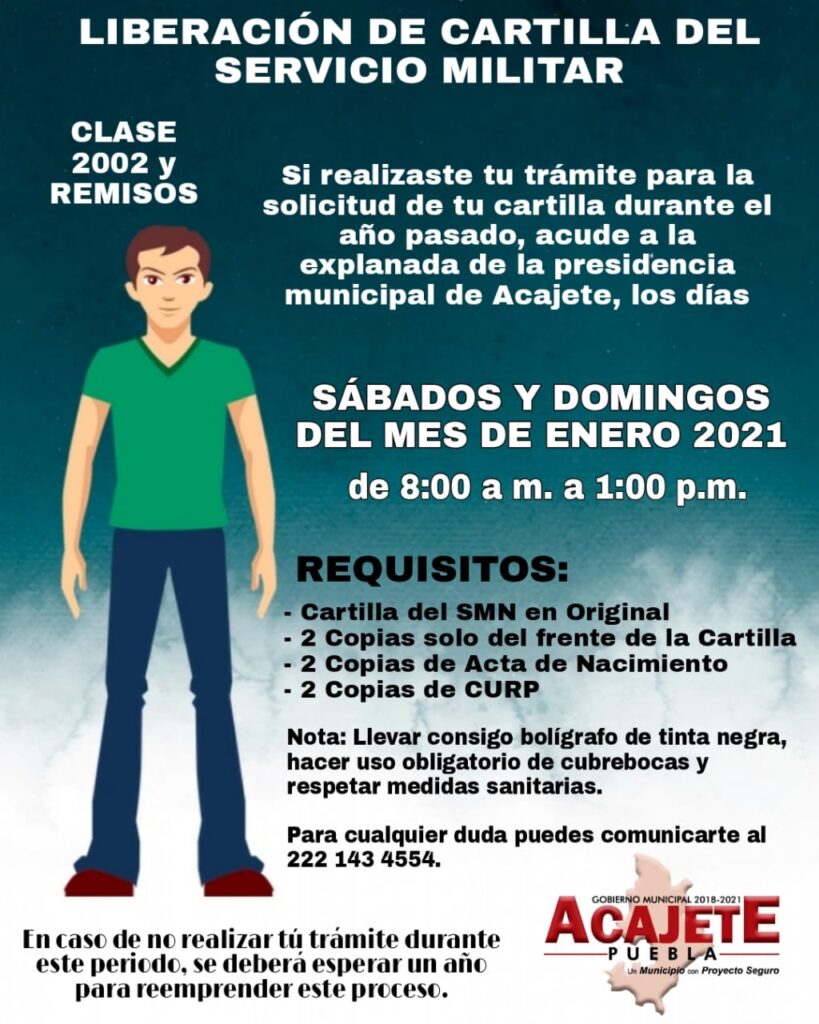 Será durante los días sábados y domingos de este mes de enero, cuando personal de las 25ª zona militar, con sede en la ciudad de Puebla, estará en este municipio, para llevar a cabo la recepción de cartillas del servicio militar nacional, para emprender el trámite correspondiente de liberación, ello dirigido a los jóvenes de la clase 2002 y remisos, es decir, para todos aquellos que realizaron su solicitud durante el año pasado.