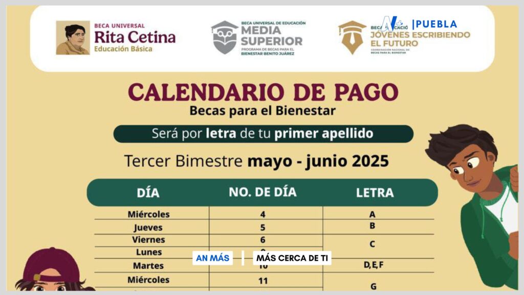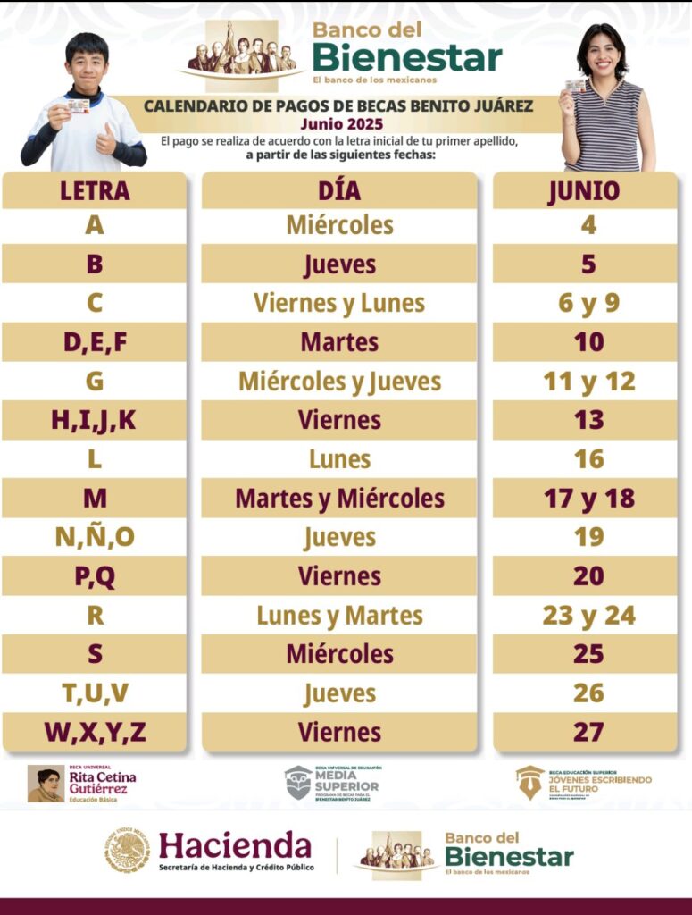 Las y los estudiantes beneficiarios de la Beca Universal de Educación Media Superior Benito Juárez, la Beca de Educación Superior Jóvenes Escribiendo el Futuro y la Beca para Educación Básica Rita Cetina recibirán el depósito directamente en sus tarjetas del Banco del Bienestar, de acuerdo con un calendario organizado por la letra inicial del primer apellido del titular.