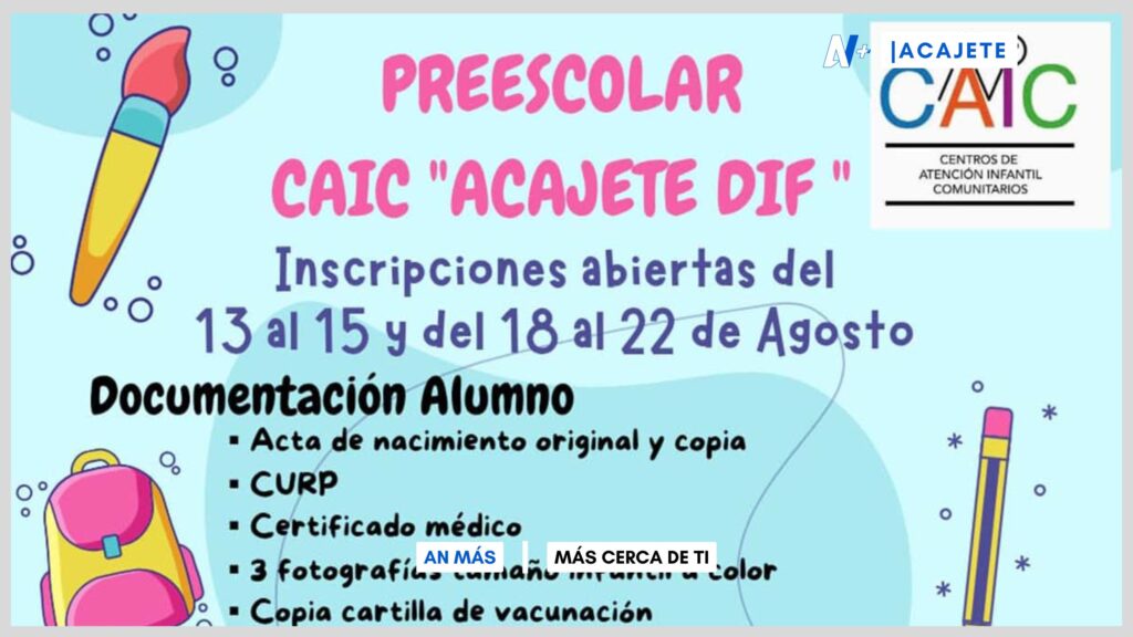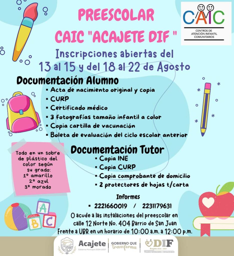 El Centro de Atención Infantil Comunitario (CAIC) de Acajete abrirá sus puertas para nuevas inscripciones del 18 al 22 de agosto, ofreciendo a las familias una oportunidad para que sus hijos den un gran paso en su formación educativa.