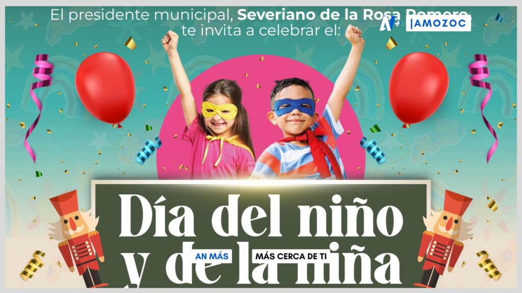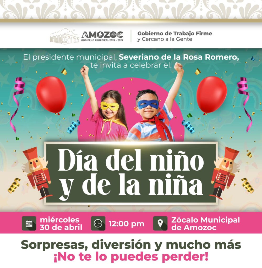 El presidente municipal de Amozoc, Severiano de la Rosa Romero, extiende una cordial invitación a todas las niñas, niños y familias del municipio para que se unan a la gran celebración del Día del Niño y la Niña, que se llevará a cabo el próximo 30 de abril en el Zócalo Municipal a las 12:00 p.m.
