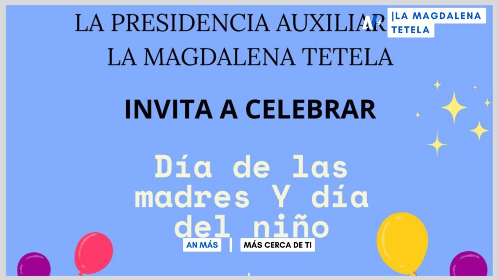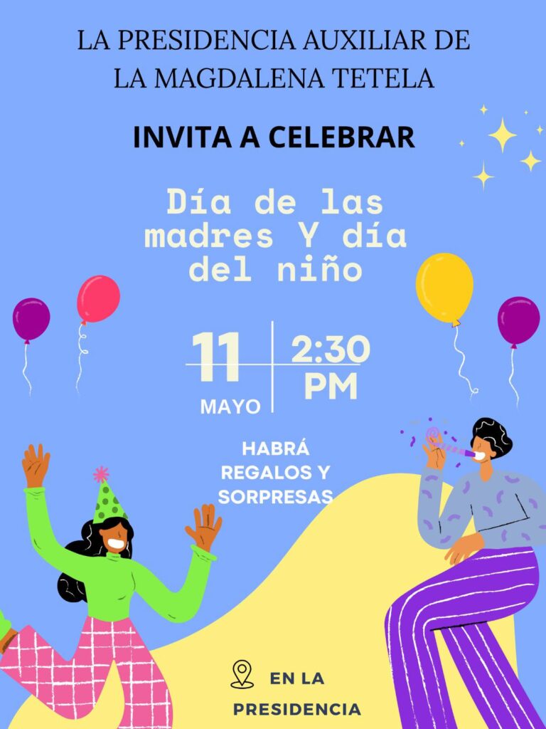 La Magdalena Tetela, Acajete, Pue.— El C. Víctor Hugo Cid Rojas, presidente de la junta auxiliar de La Magdalena Tetela, en coordinación con el Ayuntamiento de Acajete, invita cordialmente a toda la comunidad a un evento especial para conmemorar el Día del Niño y el Día de las Madres.