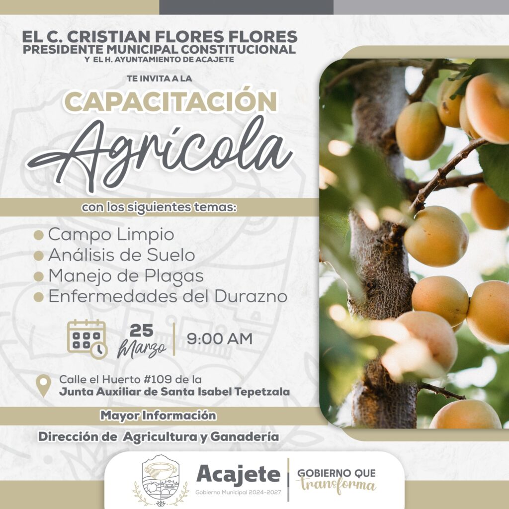 Acajete, Pue. – Con el objetivo de fortalecer el sector agrícola del municipio, el H. Ayuntamiento de Acajete y el presidente municipal Cristian Flores Flores invitan a la “Capacitación Agrícola”, un evento diseñado para mejorar las prácticas del campo a través del aprendizaje y la innovación.
