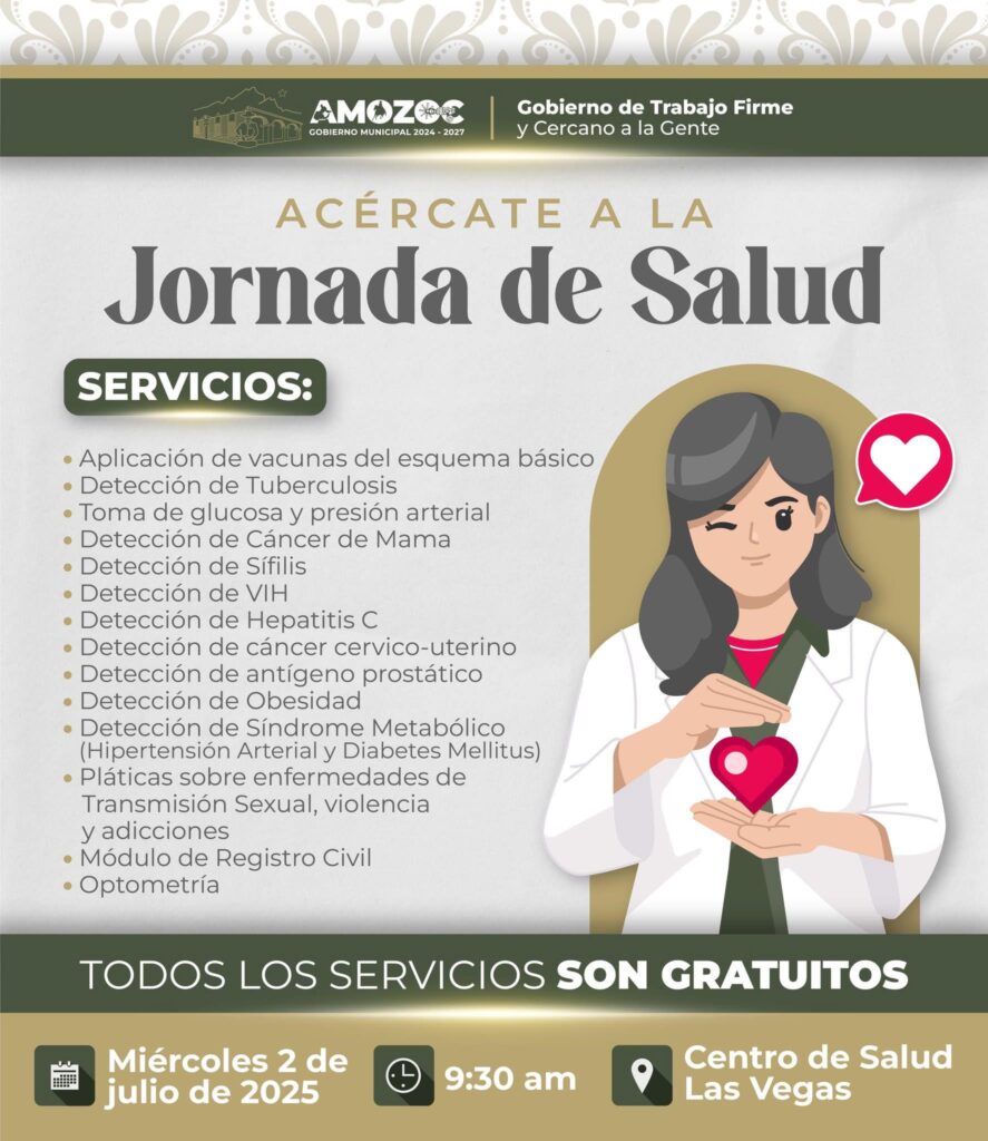 La jornada se llevará a cabo el martes 2 de julio a partir de las 9:30 a.m. en el Centro de Salud Las Vegas, donde se ofrecerán servicios médicos totalmente gratuitos, enfocados en la prevención, el diagnóstico oportuno y el cuidado integral de la salud femenina.