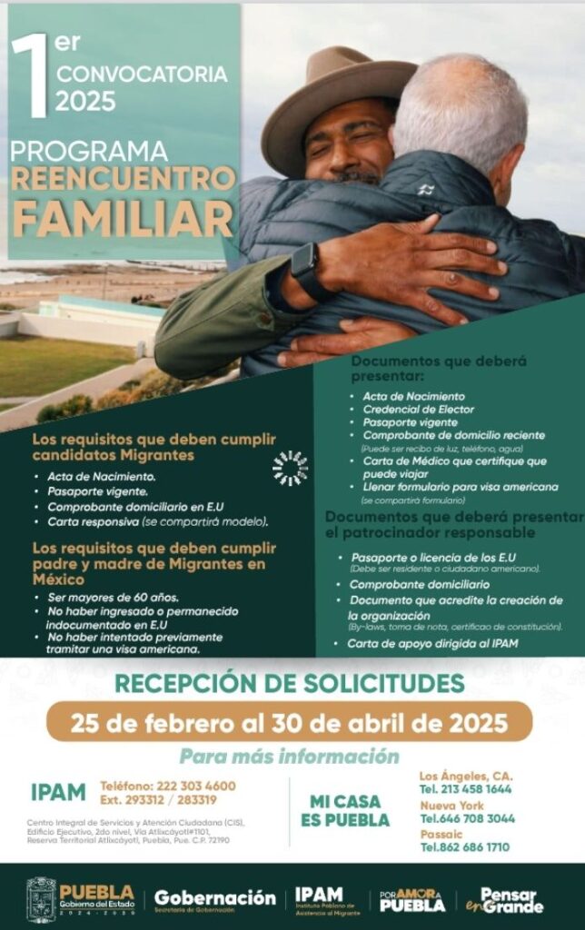 El Gobierno de Puebla, a través del Instituto Poblano de Asistencia al Migrante IPAM, ha lanzado la 1ª convocatoria 2025 del Programa de Reencuentro Familiar de Adultos Mayores. Este programa tiene como objetivo fortalecer los lazos y raíces entre poblanos que residen en la entidad y sus familiares que viven en el extranjero.