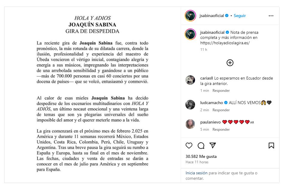 Joaquín Sabina indicó desde su cuenta oficial de Instagram que inicialmente serán siete países donde lleve a cabo su gira Hola y Adiós, los cuales serán los siguientes: