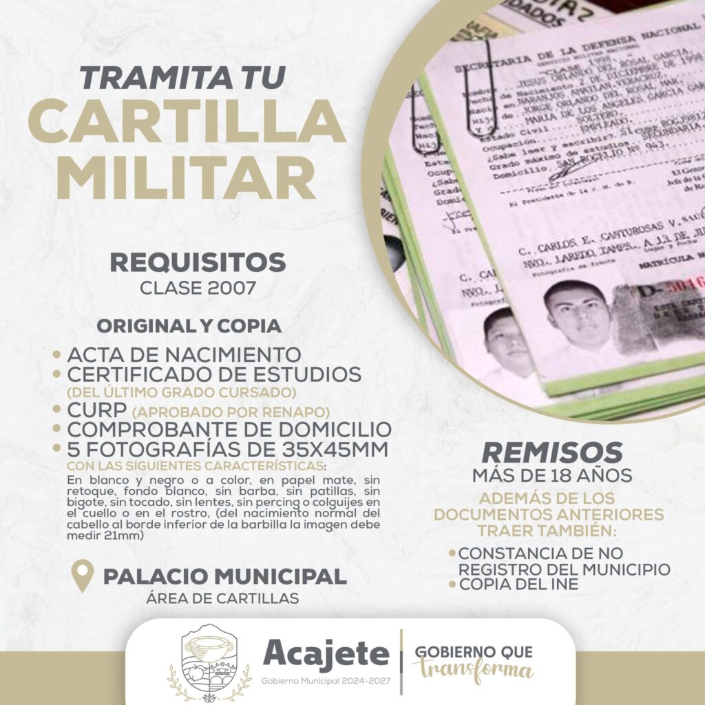 Acajete, Pue.- El gobierno municipal de Acajete ha emitido un llamado a todos los jóvenes nacidos en 2007 para que inicien el trámite de su Cartilla Militar. El proceso se lleva a cabo en la oficina de cartillas ubicada en el Palacio Municipal, bajando las escaleras y a un costado del Registro Civil.