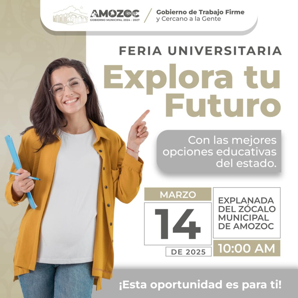 Con el objetivo de acercar a los jóvenes a diversas opciones de educación superior, el presidente municipal de Amozoc, Severiano de la Rosa, a través del Instituto de la Juventud de Amozoc (INJUVE), invita a la Feria Universitaria “Explora tu Futuro”, un evento diseñado para ayudar a los estudiantes a elegir su próximo paso académico.