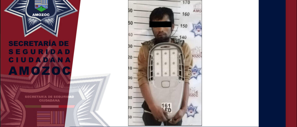 Amozoc de Mota, Pue.- Mediante recorridos preventivos de seguridad y vigilancia de la Secretaría de Seguridad Ciudadana del Municipio de Amozoc, se detuvo en flagrancia a un masculino en vía pública desmantelando una lámpara de alumbrado. El sujeto fue identificado como “José N.”.