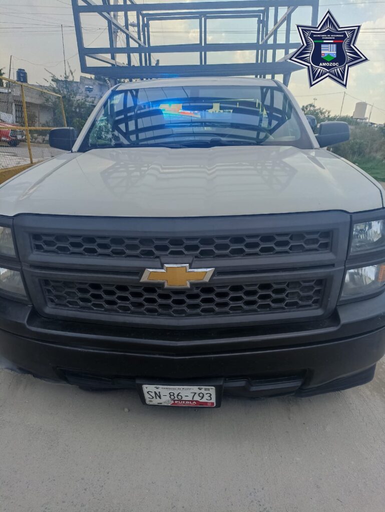 Amozoc de Mota, Pue.- Los hechos ocurrieron al momento en que los uniformados se encontraban realizando labores de proximidad social y vigilancia, cuando vía cabina C2 reciben un llamado de auxilio, por el robo de una camioneta color blanco Chevrolet, placas de circulación SN-86-793 del estado de Puebla, el propietario menciona haber sido despojado de ella a la altura de Periférico y Carretera Federal Puebla-Tehuacán.
