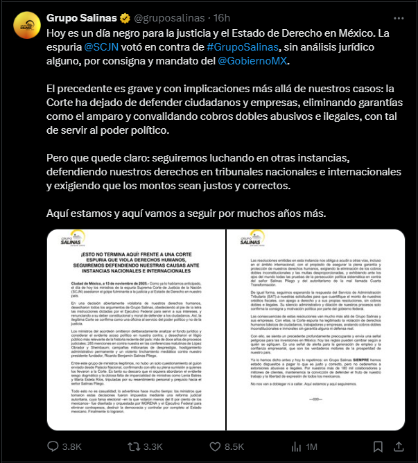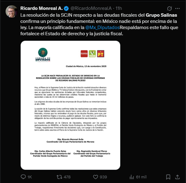 En su cuenta de X Ricardo Monreal comentó que la resolución de la Suprema Corte de Justicia de la Nacion respecto a las deudas fiscales del Grupo Salinas confirma un principio fundamental: en México nadie está por encima de la ley, y que la mayoría calificada en la cámara de Diputados respaldan este fallo que fortalece el Estado de derecho y la justicia fiscal.