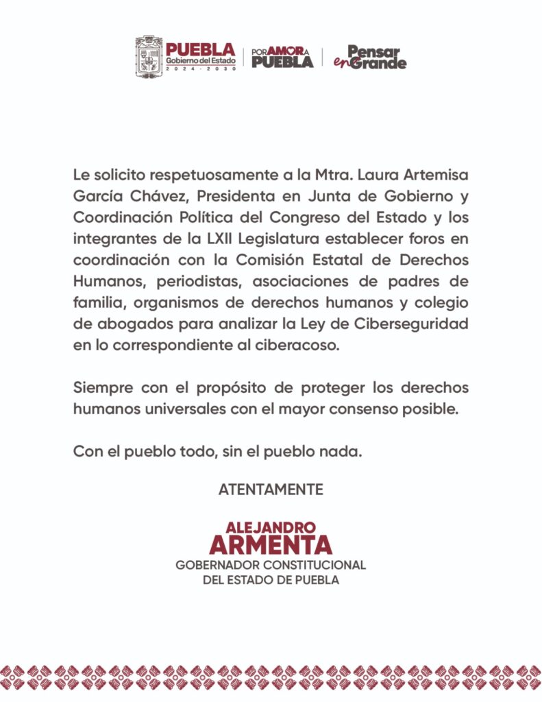 Desde el Gobierno del Estado, encabezado por Alejandro Armenta, se hizo un llamado al Congreso del Estado y a organizaciones de derechos humanos a mantener un diálogo abierto y responsable sobre la Ley de Ciberseguridad, priorizando la protección ciudadana sin reprimir libertades, bajo un enfoque de respeto a los derechos humanos.