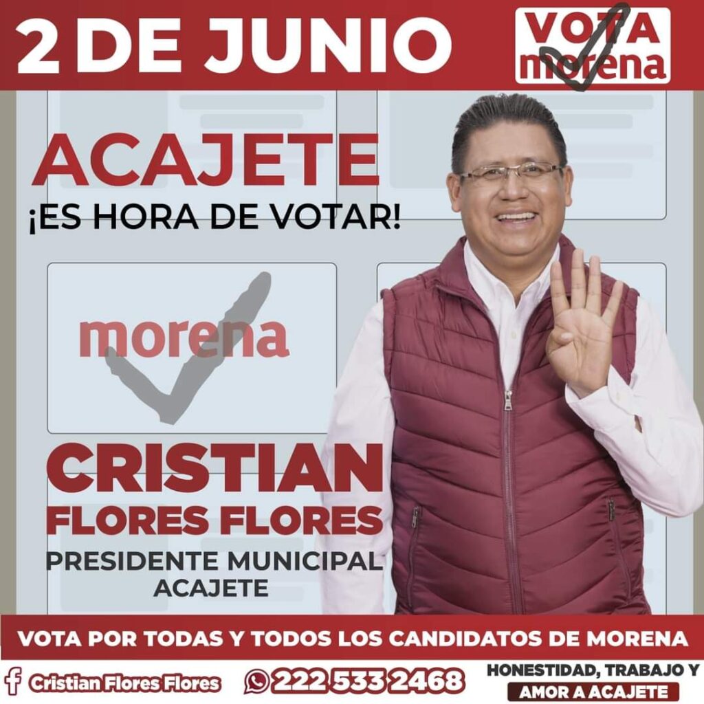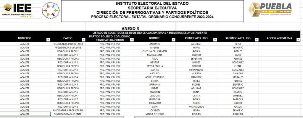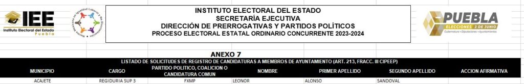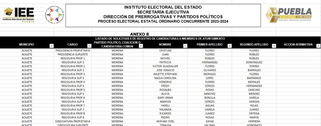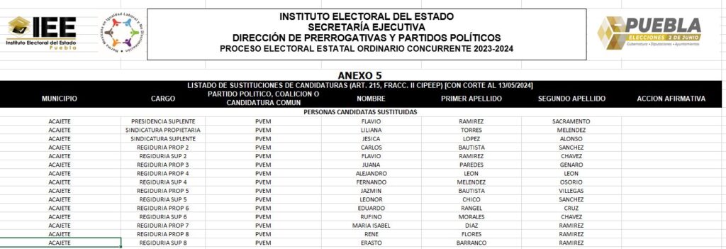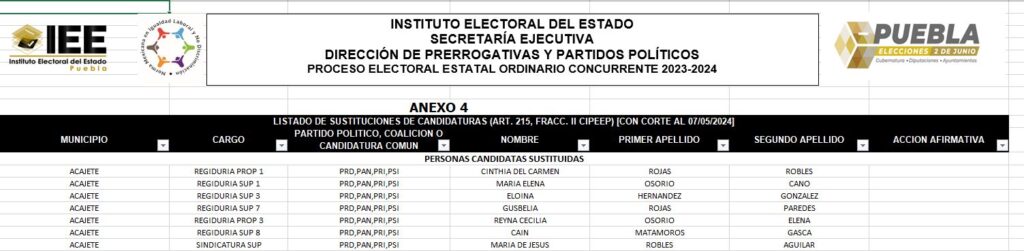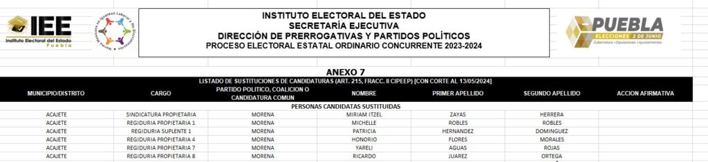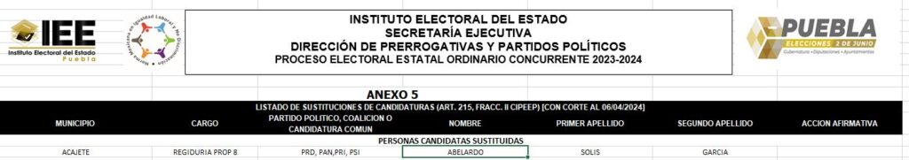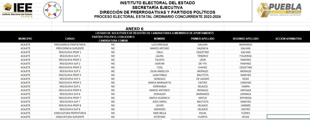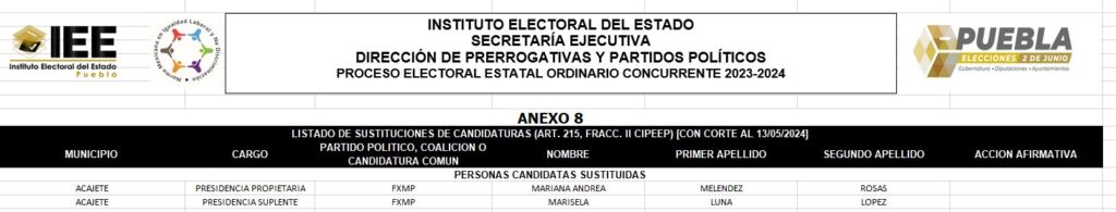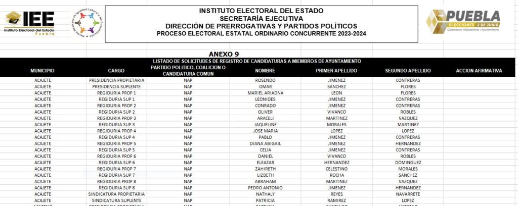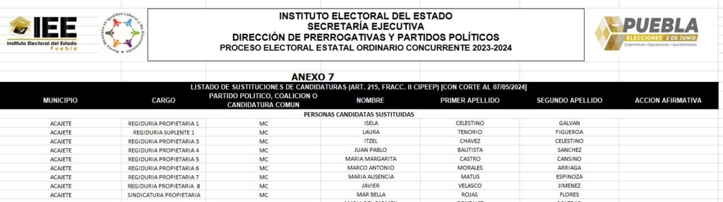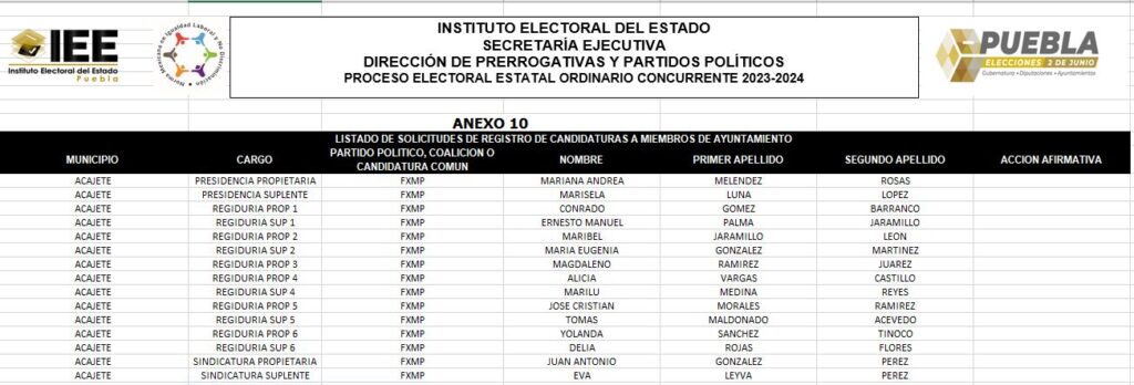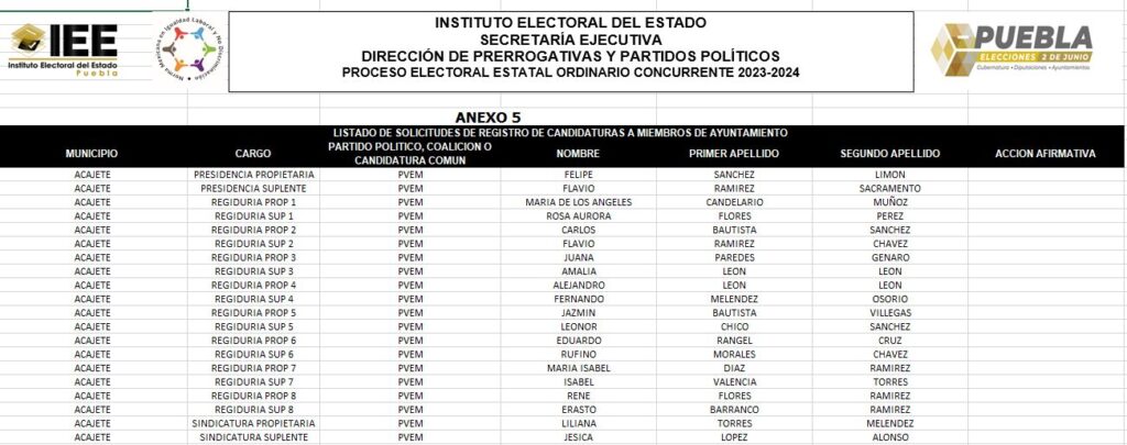 Acajete.- Estamos a 12 días para llevar a cabo la jornada electoral del 02 de Junio de 2024, entérate quienes son los candidatos a presidente municipal y conoce a su equipo de Regidores (se incluye LISTADO DE SUSTITUCIONES DE CANDIDATURAS (ART. 215, FRACC. II CIPEEP) [CON CORTE DEL 06/04/24 AL 13/05/2024]).