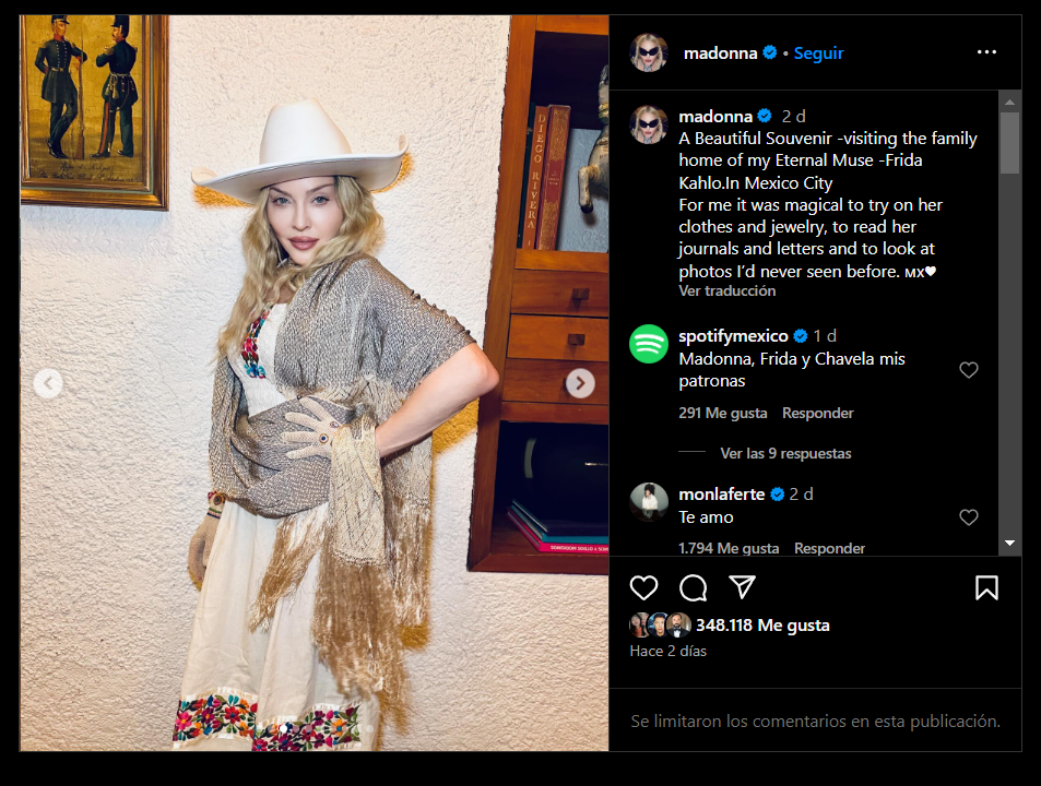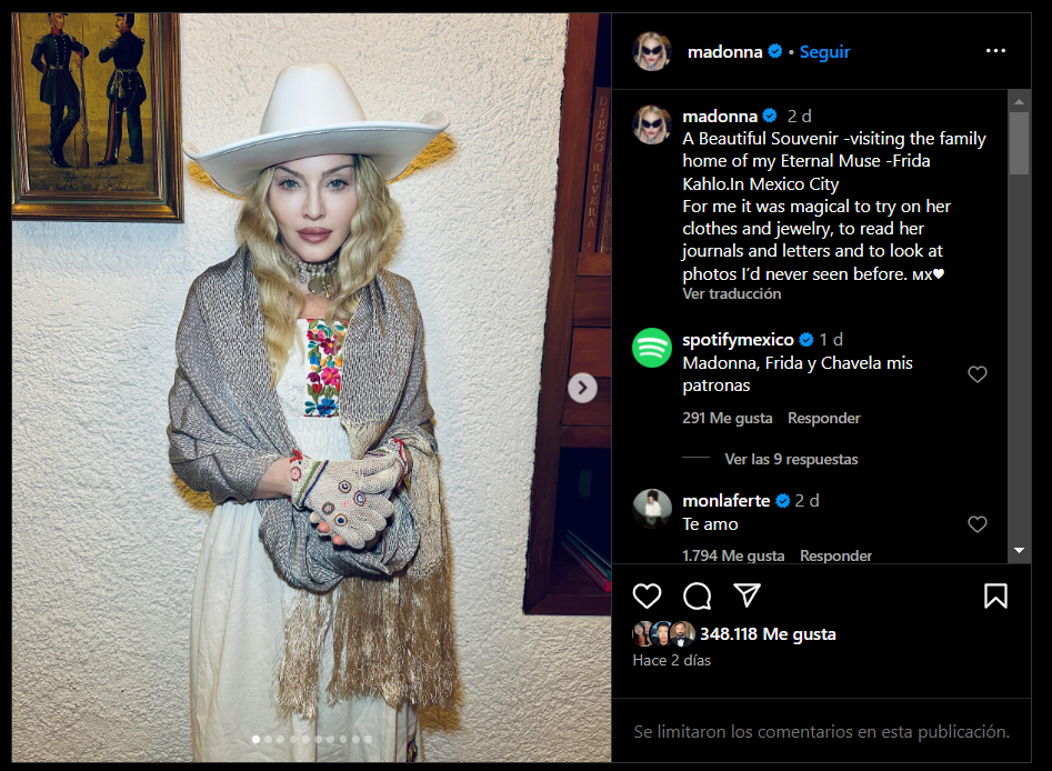 Como parte de su gira ‘Celebration Tour’, Madonna ofreció varios conciertos en México a finales de abril. Poco después, la estrella del pop publicó fotografías en sus redes sociales en las que se le ve usando un vestido con flores bordadas en el pecho y un chal que aseguraba que habían pertenecido a Frida Kahlo.