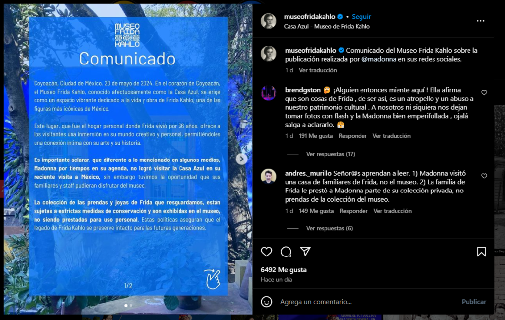 Ante la controversia generada, la Casa Azul, el museo Frida Kahlo en Ciudad de México, emitió un comunicado en el que negó que vestidos de la célebre pintora que exhibe en su colección hayan sido utilizados por la estrella del pop.