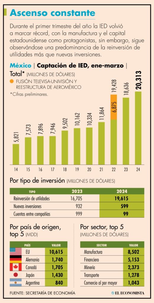 México captó flujos de Inversión Extranjera Directa (IED) por un total de 20,313 millones de dólares en el primer trimestre de 2024, un incremento de 9% interanual, considerando cifras preliminares, informó este martes la Secretaría de Economía.