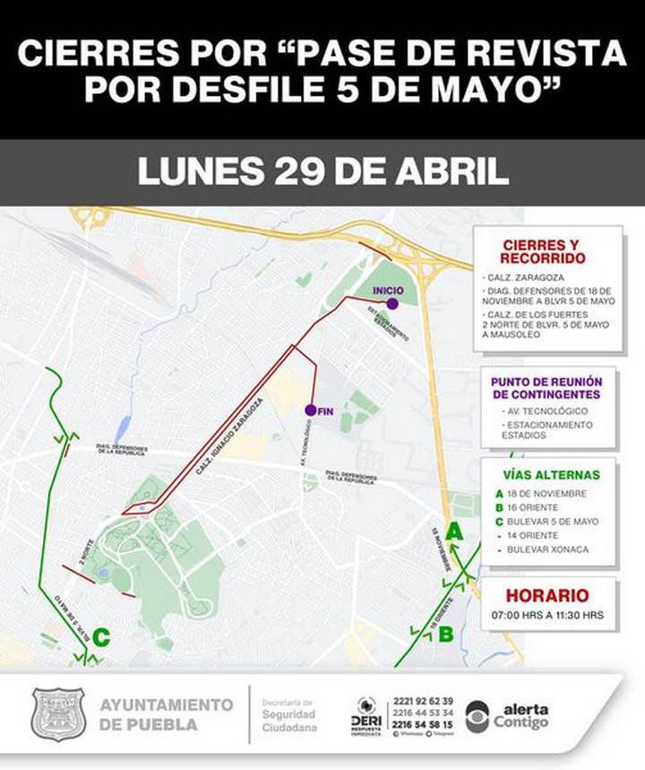 Según informó la Secretaría de Seguridad Ciudadana de Puebla (SSC), a través de su perfil en la red social de Facebook, los cierres a la circulación para la realización de esta actividad serán el próximo lunes 29 de abril entre las 7 y las 11:30 de la mañana, específicamente en la zona de la Calzada Ignacio Zaragoza, por lo que incluso compartieron algunas vías alternas para los automovilistas.