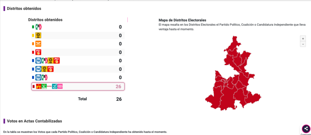 De acuerdo con los datos que da a conocer el Instituto Electoral del Estado de Puebla (IEE), se da cuenta de la recepción de 2 millones 642 mil 727 votos al momento.