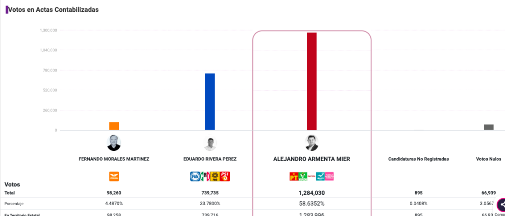 Hasta las 12:20 horas del 3 de junio, el morenista registraba más de 1 millón 200 mil voto, es decir, el 58% del total, seguido por Eduardo Rivera Pérez (PAN, PRI, PRD PSI) con 33% y de Fernando Morales (Movimiento Ciudadano) con 4.48%.