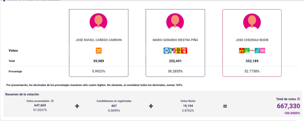 De acuerdo con el programa de Resultados Electorales Preliminares hasta las 12:20 horas del 3 de junio, detrás de Chedraui Budib quedaría Mario Riestra, candidato del PAN, PRI, PRD PSI CON EL 38% de los sufragios y posteriormente Rafael Cañedo, de Movimiento Ciudadano con 5.99%.